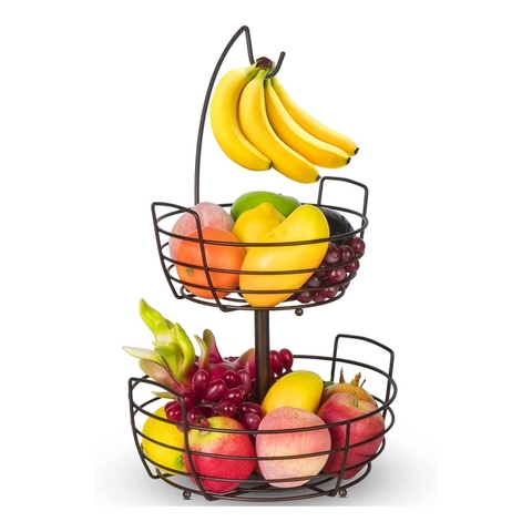PF-FB017 2 Tier Fruitmand Voor Keuken Met Bananenhanger, Fruitschaal Voor Aanrecht Broodmand Fruithouder